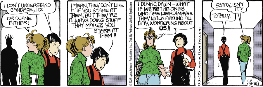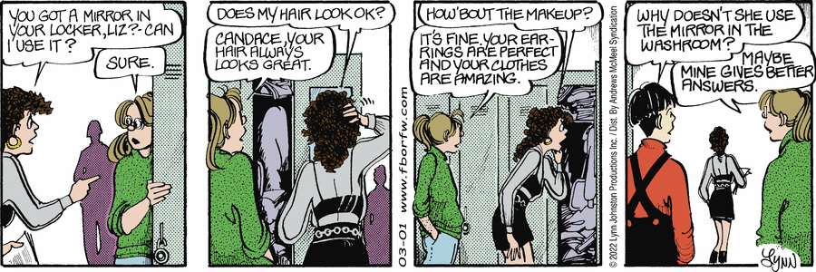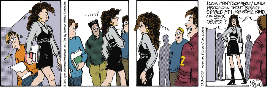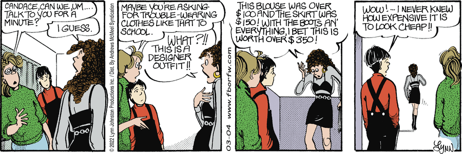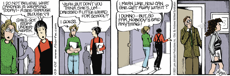Lynn's Comments: This series of cartoons received a heated response. Some readers took issue with me for suggesting Candace was dressing inappropriately, others were supportive and thought she should be told to change.